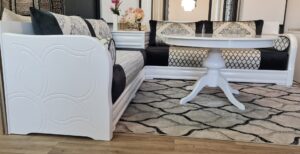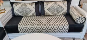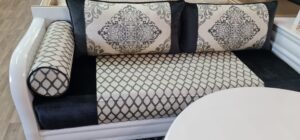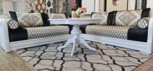 Sublimez votre salon avec ce somptueux tissu en brocart, mélange parfait d’élégance et de sophistication. Avec son design en noir et blanc contrasté et ses motifs géométriques et floraux délicats, ce tissu est idéal pour un salon marocain moderne et raffiné.