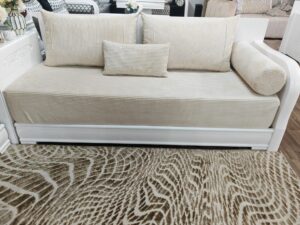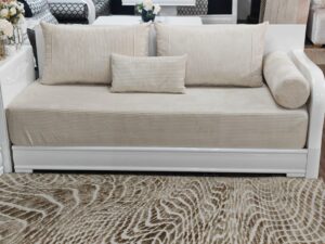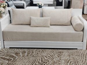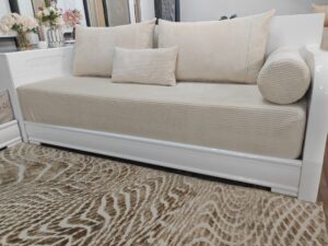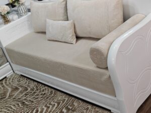 Créez une ambiance chaleureuse et apaisante dans votre salon marocain avec ce tissu en velours côtelé beige. Sa texture douce et ses lignes élégantes offrent une combinaison parfaite entre style moderne et confort intemporel. Ce tissu est idéal pour les salons marocains minimalistes et élégants.