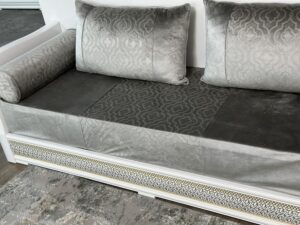 Notre spécialité est la vente de l’habillage en tissu. Nous proposons des ensembles de housses de haute qualité, déjà cousues et prêtes à être installées sur vos propres structures en bois (sedari) et mousses. C’est la solution parfaite pour donner un nouveau look à votre salon marocain à Argenteuil sans tout changer.